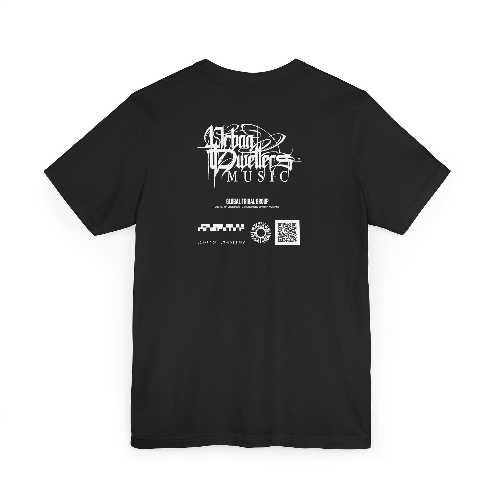 Black, lightweight cotton tee printed front and back with a raw, cinematic design. The front shows a high-contrast monochrome portrait with moody shadows, while the back features layered logotypes, a QR code and small icon marks — a look that reads like band merch or an underground label release. Wear it to show allegiance to late-night sets, basement shows, and crate-digging sessions. The soft, breathable fabric and retail fit make it easy to layer under jackets or wear solo while you're mixing tracks, heading to a gig, or just walking the city after hours. Subtle distressing in the print and the compact crew neckline keep the vibe effortlessly worn-in and authentic.